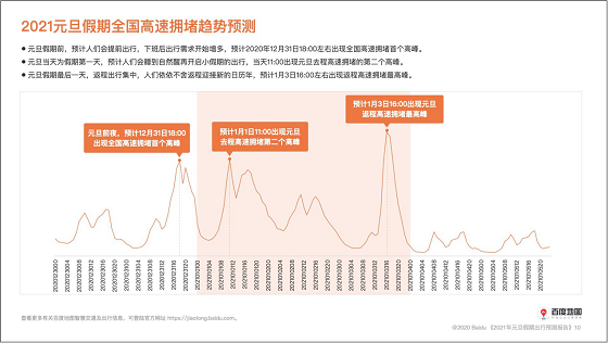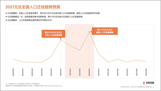 历经疫情洗礼的2020已进入倒计时阶段,2021即将满载憧憬到来。为迎接新的一年,百度地图联合交通运输部科学研究院综合交通大数据应用技术重点实验室、KuWeather共同撰写并发布《2021元旦假期出行预测报告》(以下简称《报告》),从人口迁徙、交通拥堵、热门景点、天气状况等多个维度预测元旦“出行热”,为用户提供出行参考。即将到来的元旦假期为2021年1月1日至3日,据《报告》显示,12月31日和1月3日将迎来人口迁徙和高速拥堵高峰,避寒“圣地”三亚、厦门、广州将迎来游客热潮,上海、西安、重庆等地热门商圈的跨年钟声将在万众瞩目中敲响。