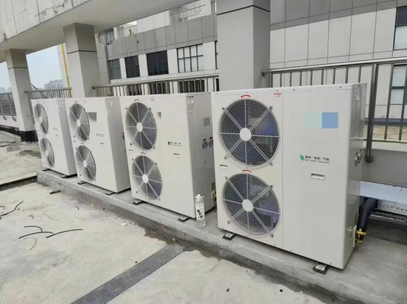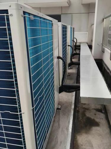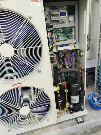 本次项目采用的一体式热泵机组,由钣金壳体、压缩机、冷凝器、蒸发器、喷液电磁阀、电子膨胀阀控制器、电子膨胀阀、高低压平衡启动阀、制冷管路、冷凝调速风机及智能电控系统等组成,集成度高、结构紧凑。