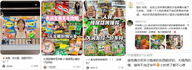 这股“小份经济”的趋势已不仅仅停留在卖场。在微博、小红书、抖音等社交平台,每次关于“大润发均一价”的话题讨论一直居高不下。“ 在线上买所谓划算的大包装看似省了几块钱, 但是一个人吃的难受不说还容易放坏掉,吃的东西还是现吃现买少囤货才能避免浪费”一位小红书用户评论评论道,获得数百个点赞。